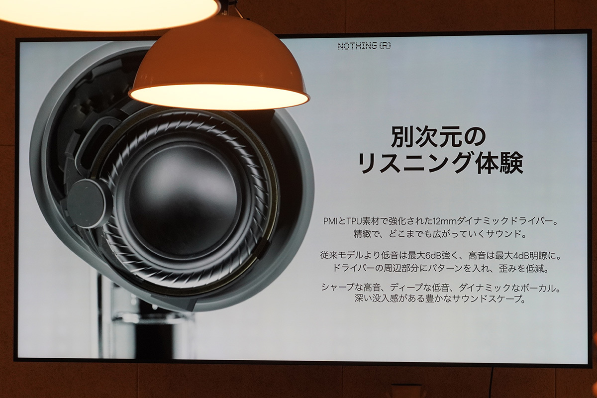 PMIとTPU素材で強化された12mmダイナミックドライバーを搭載。「Headphone (1)」と同じく、ドライバーの振動板には高剛性ニッケル被膜を採用し、高音の明瞭さと低音の力強さを高めたという。低音は最大で6dB、高音は最大で4dB向上し、より明瞭になったと同社は説明している。なお本機の音質設計には、オーディオブランドKEFは関わっていない。