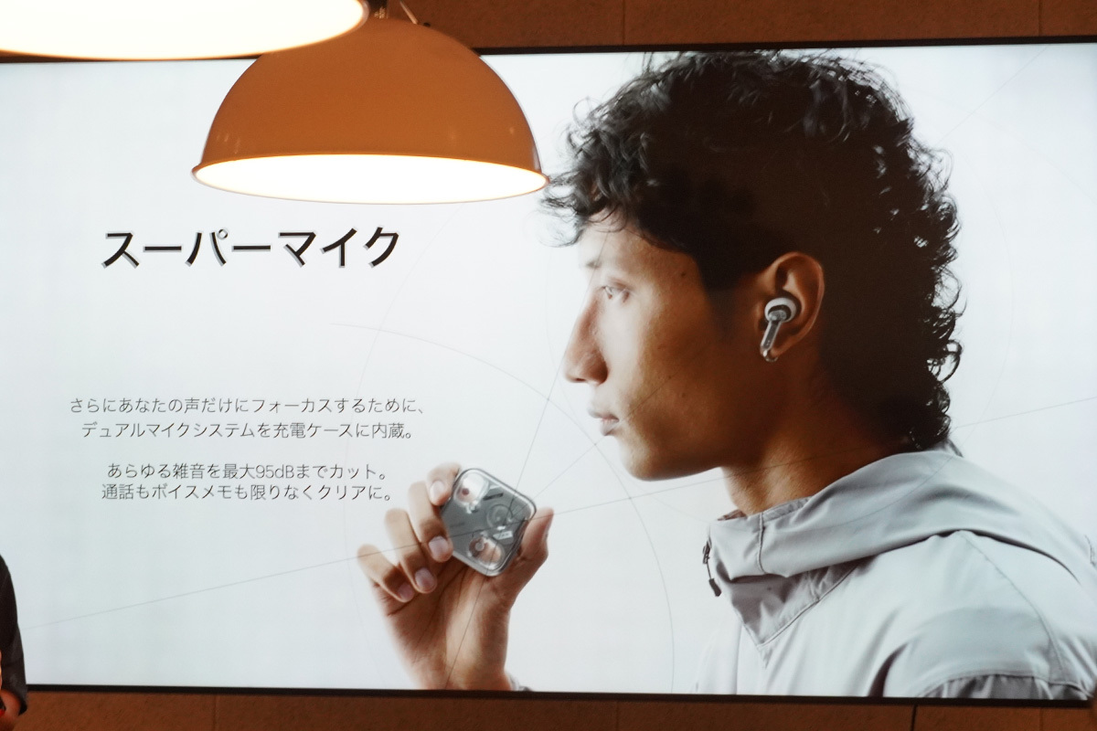 スーパーマイクを起動しているときは、Ear (3)の内蔵マイクと同時利用になり、ハウリングといった状況を防ぐためAIで処理しているという。また、音声処理はEar (3)を経由するため、イヤホン本体を充電ケースに入れた状態ではスーパーマイクの使用はできない。