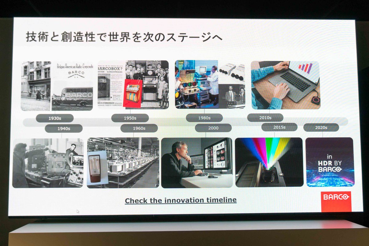 1934年に創立後、テレビ、ジュークボックス、超音波ワイヤレスリモコン、業務用プロジェクター、医療用ディスプレイなど、さまざまなプロシューマ―向けデバイスを開発し続けてきた「BARCO(ベルギー・アメリカン・ラジオ・コーポレーション)」。