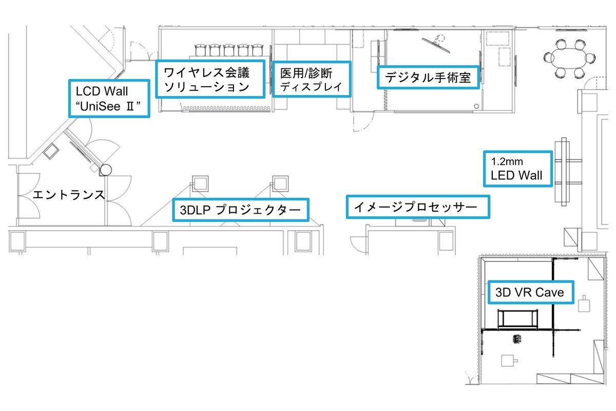 「エキスペリエンスセンター」は、3DLPプロジェクター/LCD Wall “UniSee II”/1.2mm LED Wall/3D VR Cave/医用・診断ディスプレイ/デジタル手術室/ワイヤレス会議ソリューション/イメージプロセッサーといった業務用ハードウェアを展示している。