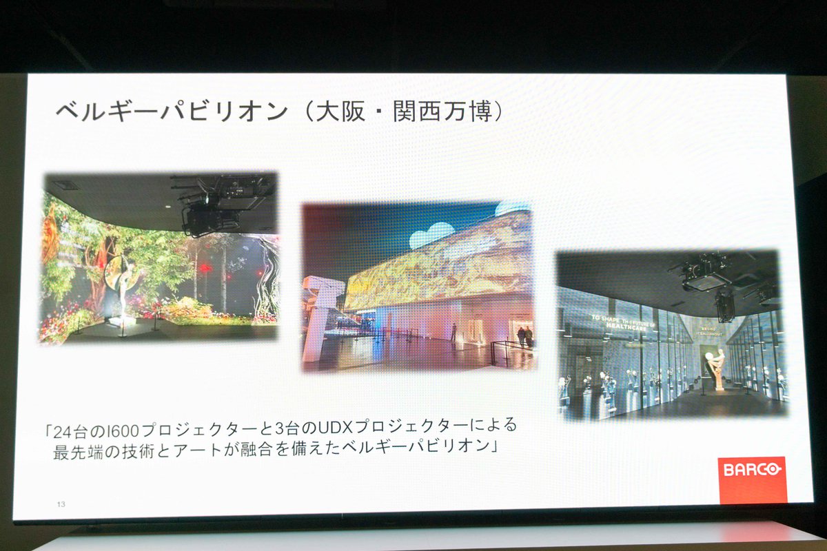 大阪万博のベルギー・パビリオン内にある映像出力機器はバルコブランドが採用されており、4Kプロジェクター「I600」を24台、同じく4Kプロジェクターの “UDXシリーズ” を3台設置されているという。またほかにもインドネシア/ポルトガル/チュニジアのパビリオン、台湾テックといった部分でも導入されていると明かした。