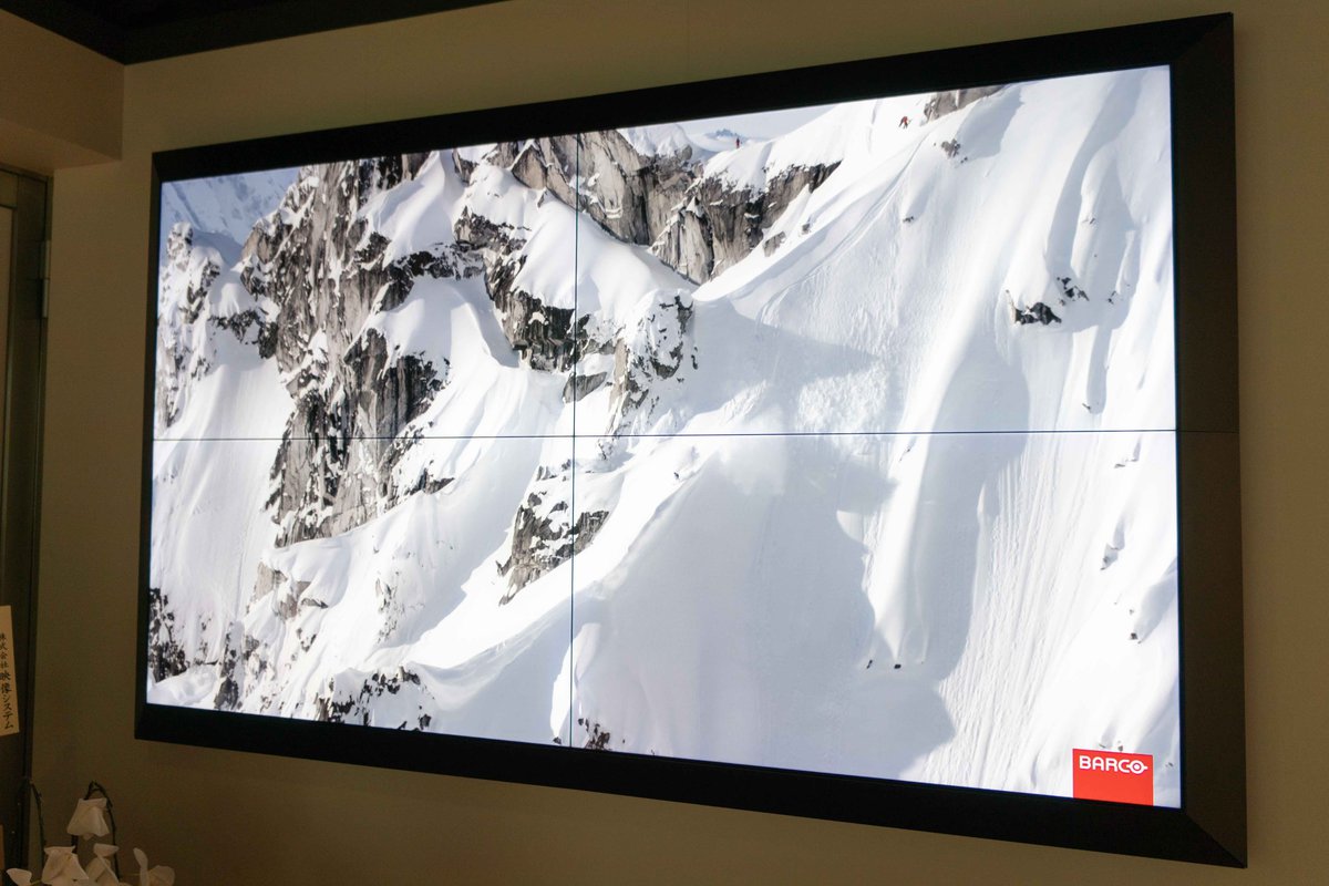 入口近辺にあるLCD Wall “UniSee II” では、高輝度アプリケーション用の55型ベゼルレスタイル型LCDビデオウォールを設置。NoGapテクノロジーを採用したベゼルレス設計により、タイル間の目地がほとんど目立たないのが特徴であり、色と輝度の自動連続キャリブレーションソフトウェアによって非常にバランスの良い映像を出力できるパネルだという。