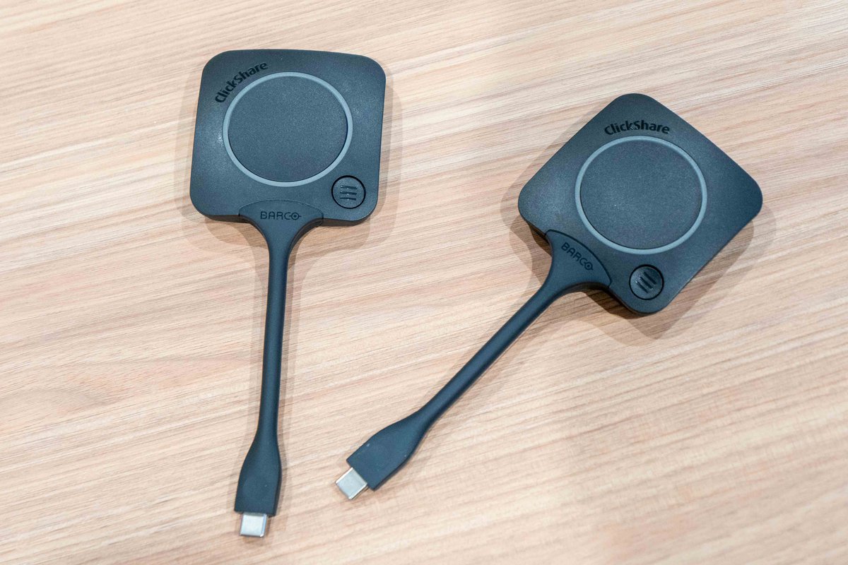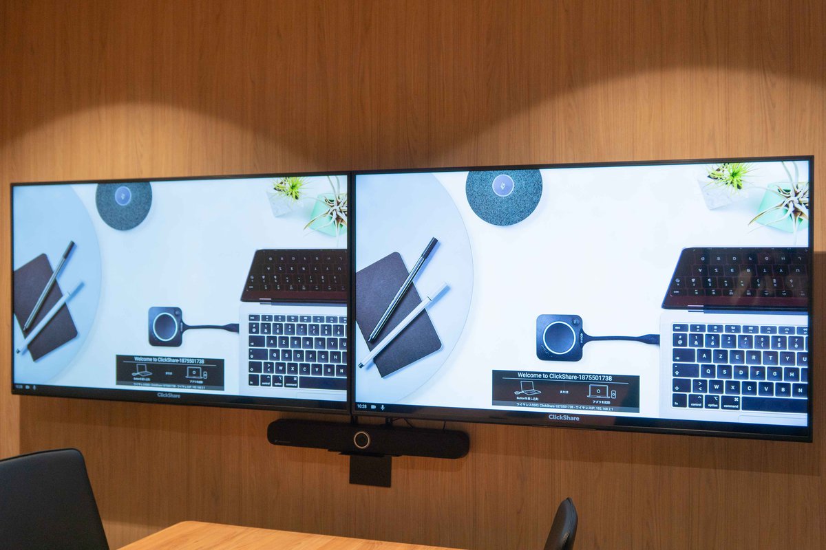 ワイヤレス会議ソリューションのカテゴリーでは、オンライン会議をさらに快適にするワイヤレスコンファレンスシステム「ClickShare Conference」による快適性を体感できるシーンとなっている。ルーム内にはデュアルディスプレイが設置されており、ClickShareが入っている会議室にノートPCを持ち込むと自動で人が入ってきたこと検知し、ボタンユニットをノートPCのUSB端子に接続し、ボタンをクリックするだけで、7秒以内という驚異的な速さでオンライン会議をスタートできるシステムとなっている。