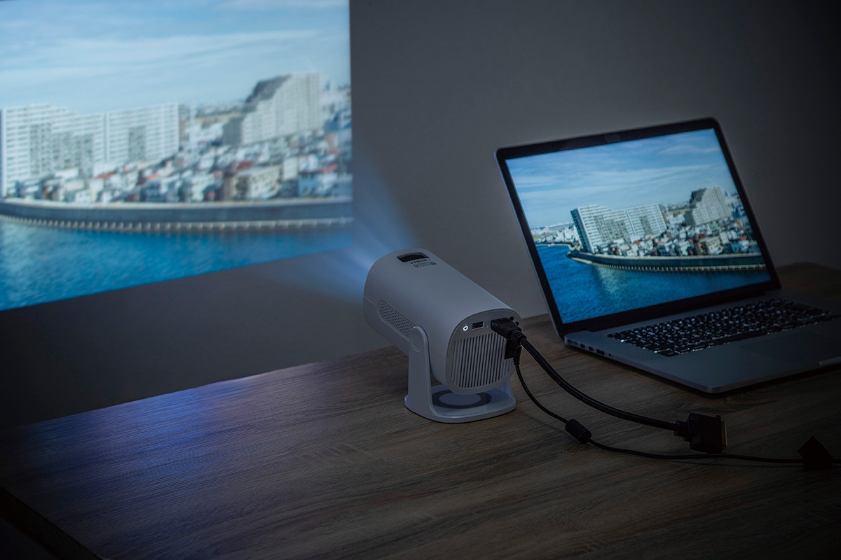 片手でも持てるコンパクトなボディに約630gという軽量。明るさは110ANSIルーメンで最大120インチでの投影に対応する。HDMI接続でスマートフォンやTVスティック、ゲーム機、PCなどの映像を投影できる。HDMI端子のバージョンはHDMI1.4。