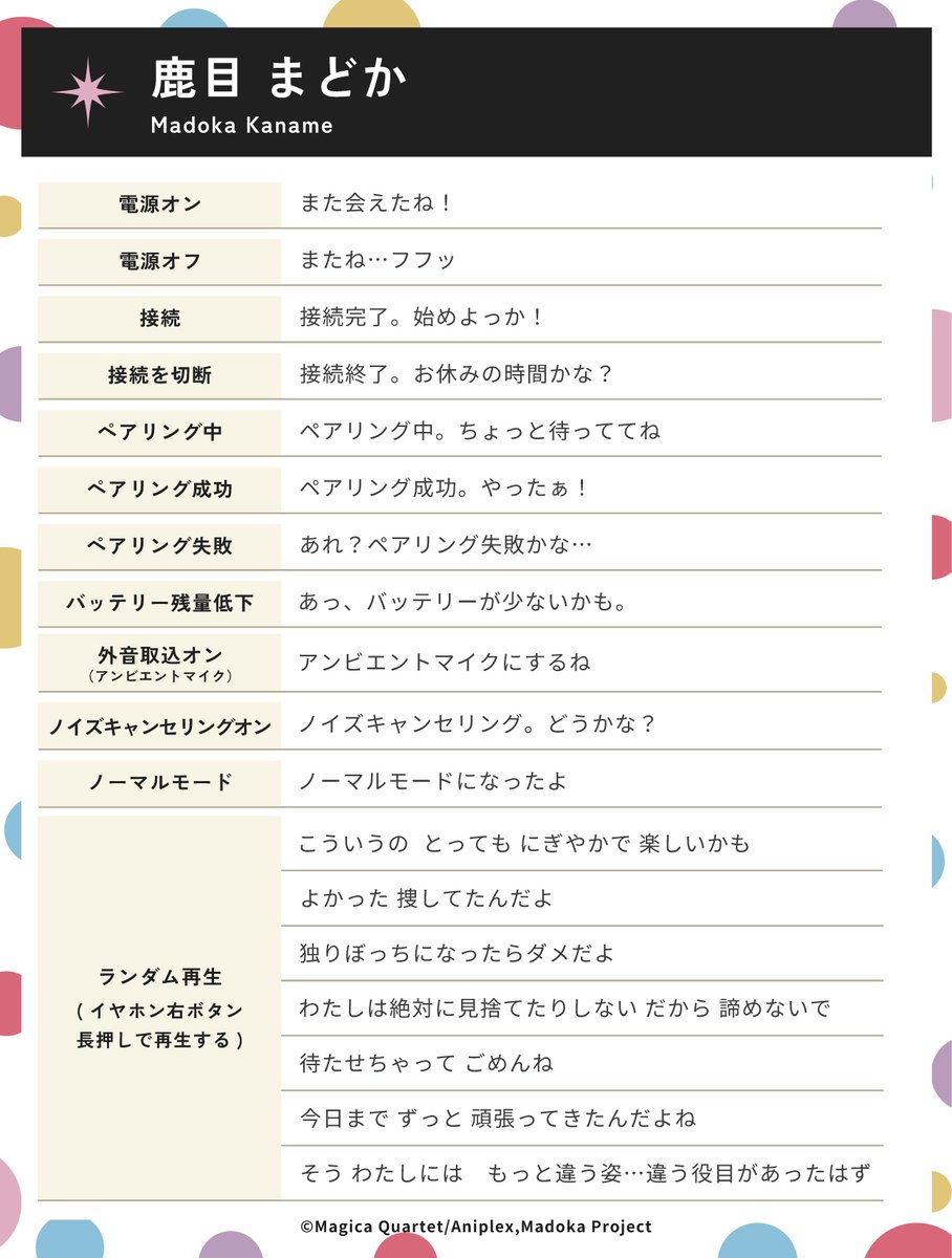 主要キャラである「鹿目まどか」「暁美ほむら」「巴 マミ」「美樹さやか」「佐倉杏子」「キュゥべえ」「ベベ」の単体7モードの他、「まどか・ほむら」「さやか・杏子」「マミ・ベベ」の掛け合いモードを搭載。合計10種のボイスモードを専用のアプリで簡単に切り替えて楽しめる。