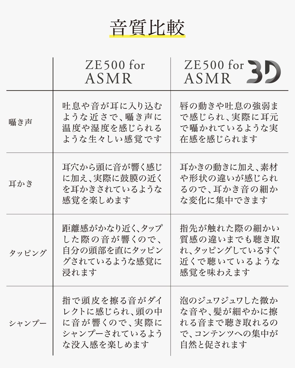 ZE500 for ASMR 3Dは、ASMR作品に最適化した完全ワイヤレスイヤホン「ZE500 for ASMR」をベースに、音質設計を “超近接音場特化” から “近接3D音場特化” に変更したモデル。