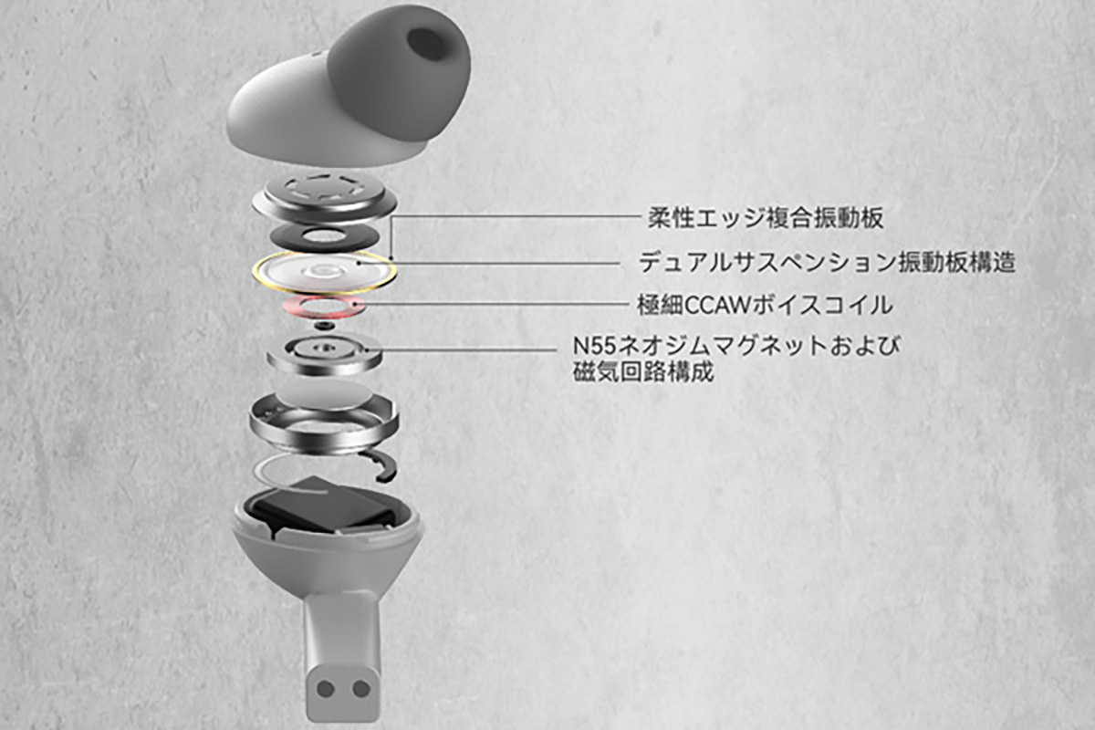 13mmリング型片面駆動ドライバーは、磁気回路をN55ネオジウム磁石と極細CCAWボイスコイルで構成。これにより、高い変換効率と低い歪率、滑らかな高域の伸びを実現したとアピールしている。また、DSPチップによる音質の最適化も施され、「HiFi レベルの音質をしっかりと体験」できるという。