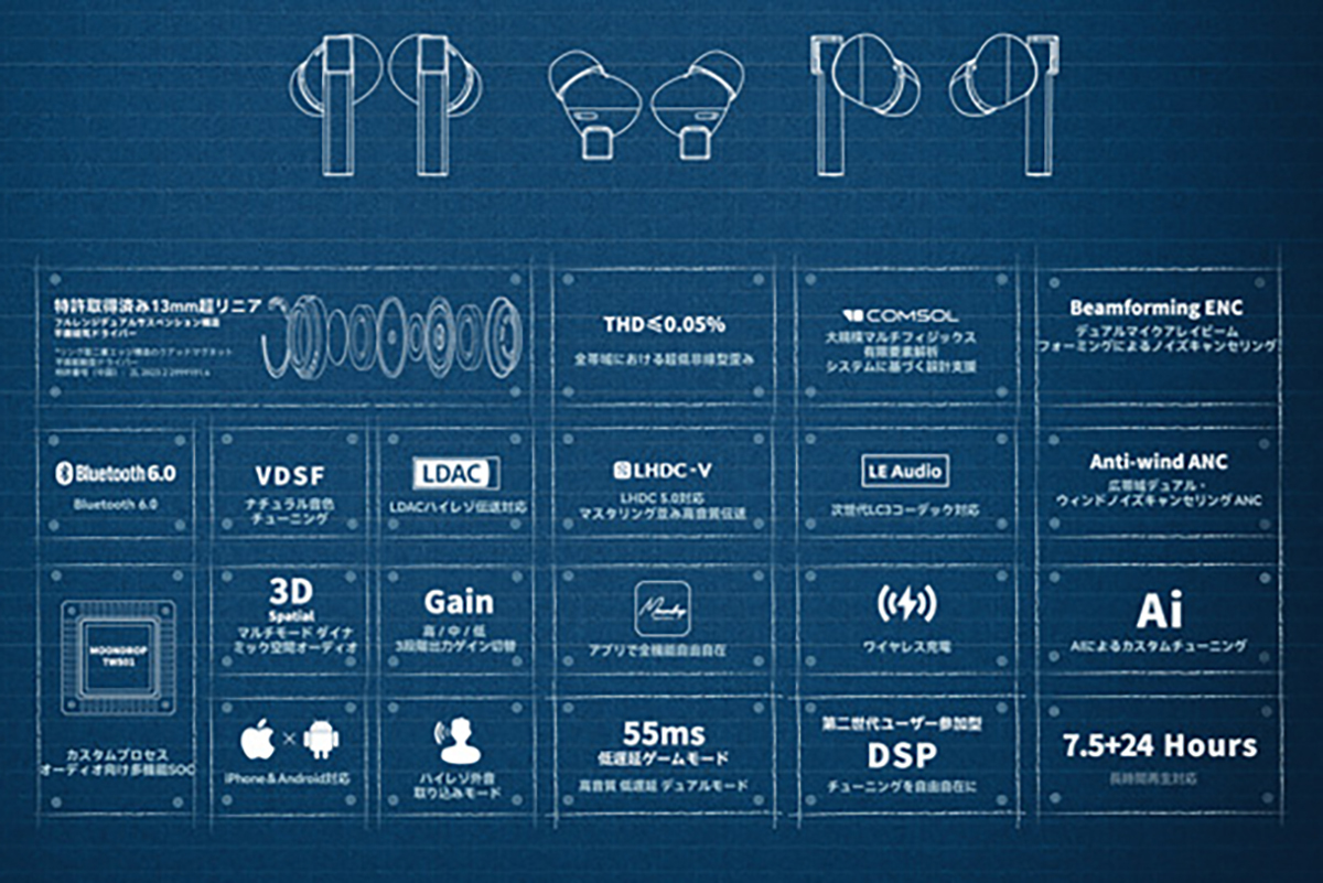 SoCには、さまざまなオーディオ関連機能を余裕をもって処理するべく大手オーディオチップメーカーと共同開発した、22nmプロセスの「MOONDROP TWS-01」を搭載。SNR 106dB、25mW+25mWのアナログ出力を備えるとともに、本モデルの全機能を同時駆動できるとアピールする。