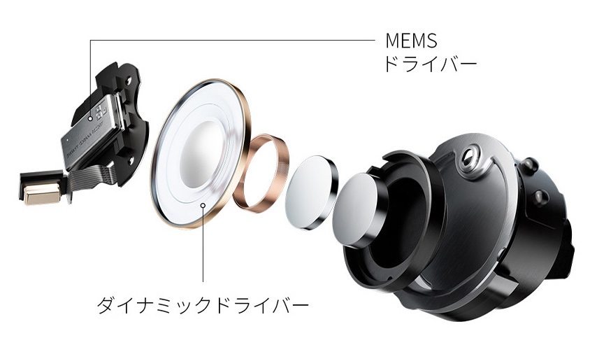 MEMS+は優れた応答速度を誇るxMEMS Labs社製MEMSドライバー「Cowell」を、専用設計された高効率パワーアンプIC「XAA-2000 Aptos」で駆動。繊細で歪の少ない正確な音表現を実現したという。ダイナミックドライバーはデュアル銅線を使用し、PU+PEEK素材のφ10mm複合振動板を採用する。