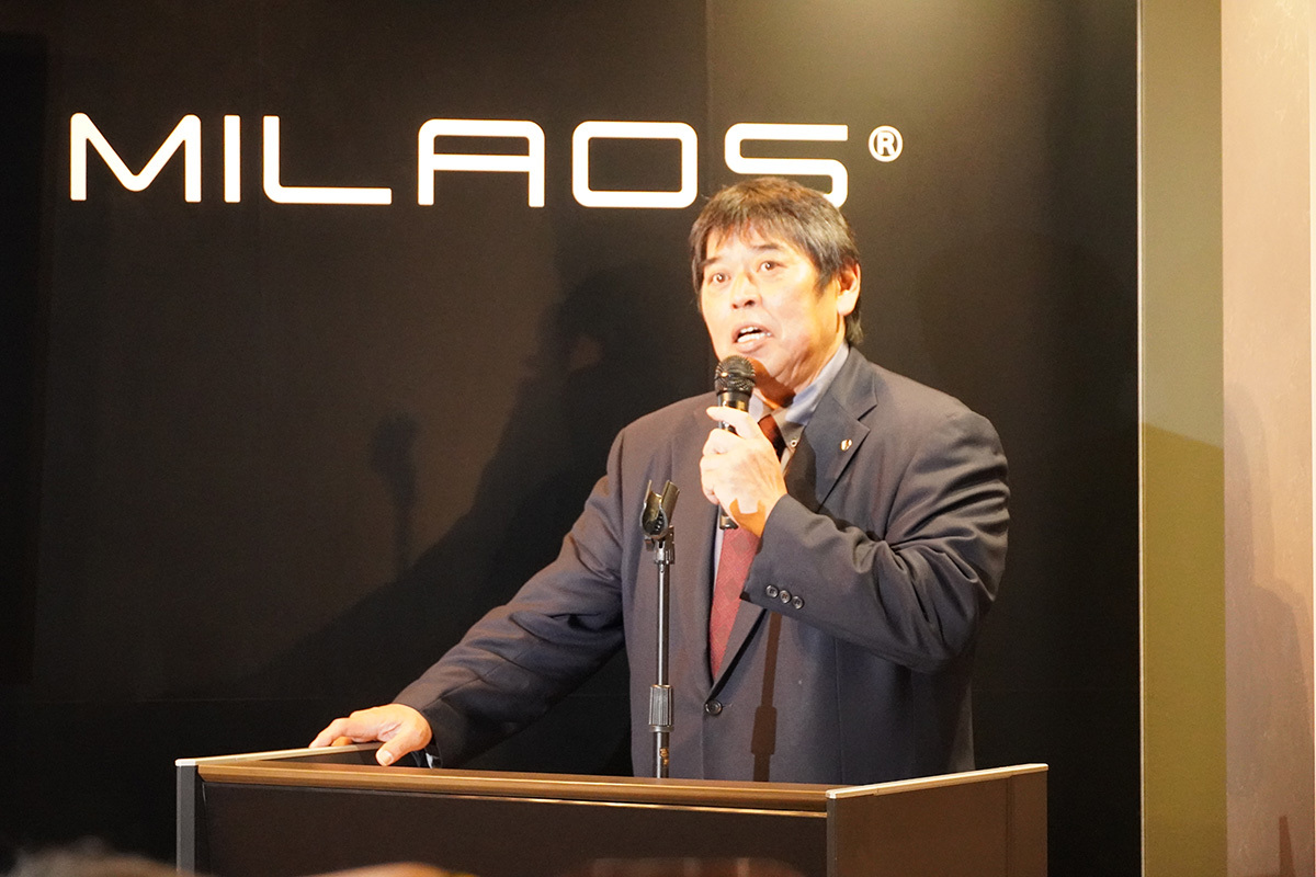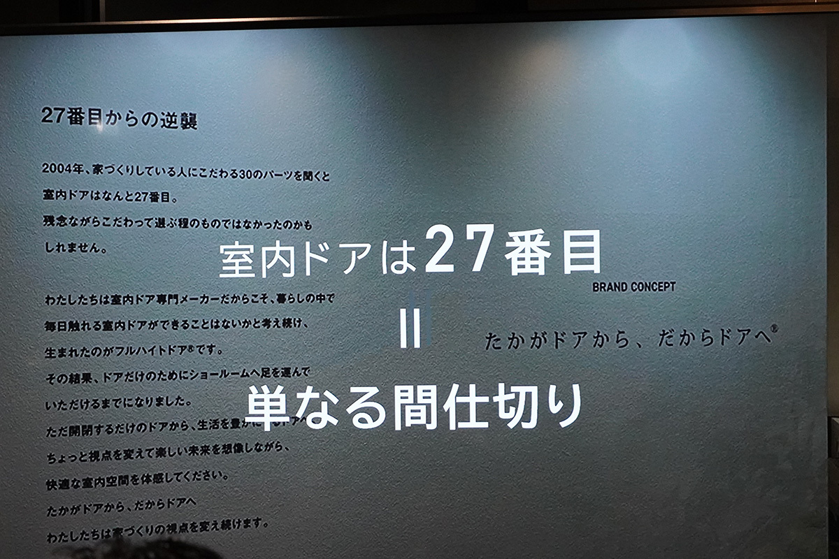 (株)KAMIYAは、ドアを専門に扱う会社で、デザイン性が高く天井までの高さがある「フルハイトドア」を展開している。リクルートが関東で実施した約5,000件の “家のどの部分が素敵か” というモニター調査によると、内装部品の30項目からドアは27番目だったという。その中でドアの価値を高め、5番以内を目指したいという気持ちでさまざまな展開を行ってきた。その一環で「27番目からの逆襲」を掲げMILAOSを発売したとのこと。
