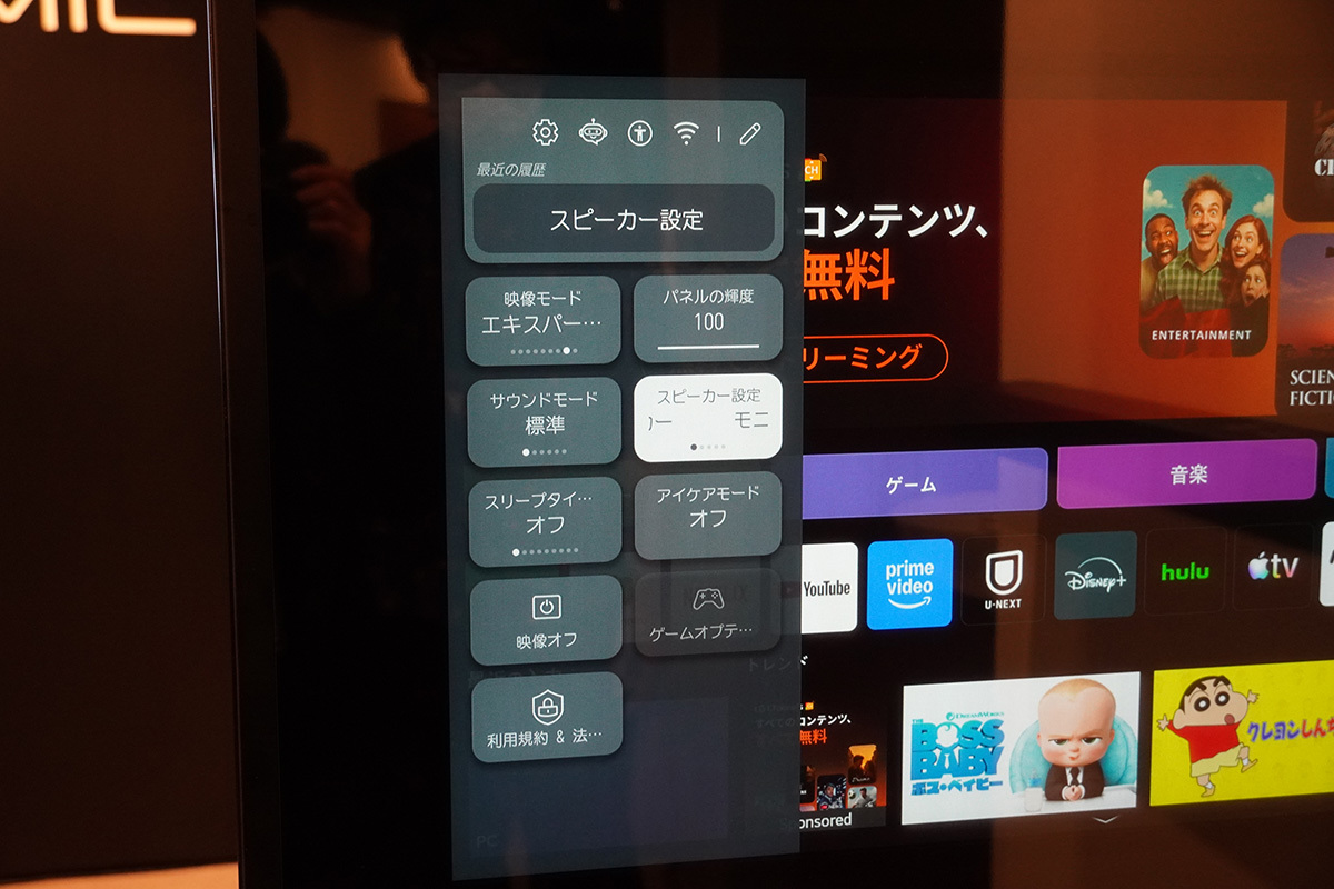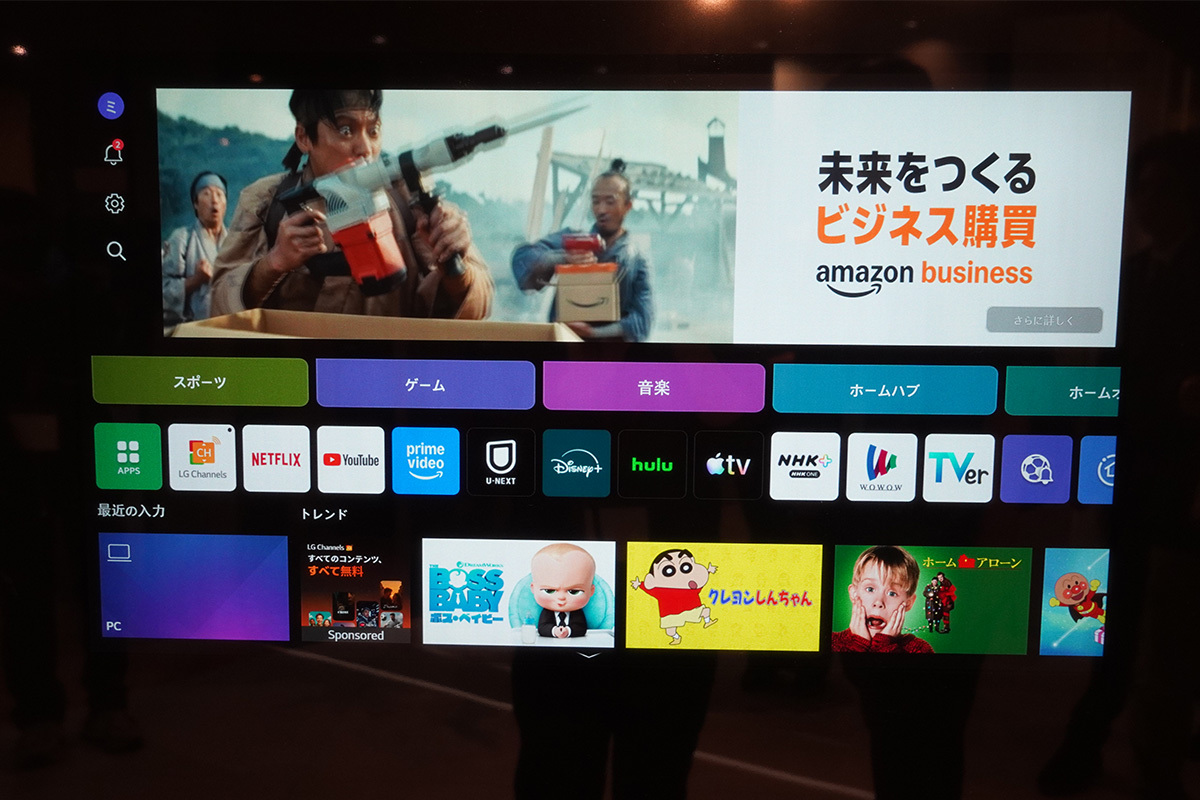 モニターにはLGのwebOSが搭載されており、YouTubeやNetflixなど各種VOD(ビデオオンデマンド)を視聴できる。スマートフォンやパソコンのミラーリングも可能で、例えばスマホ内に保存してある写真を一緒に見るなどといった使い方もできる。