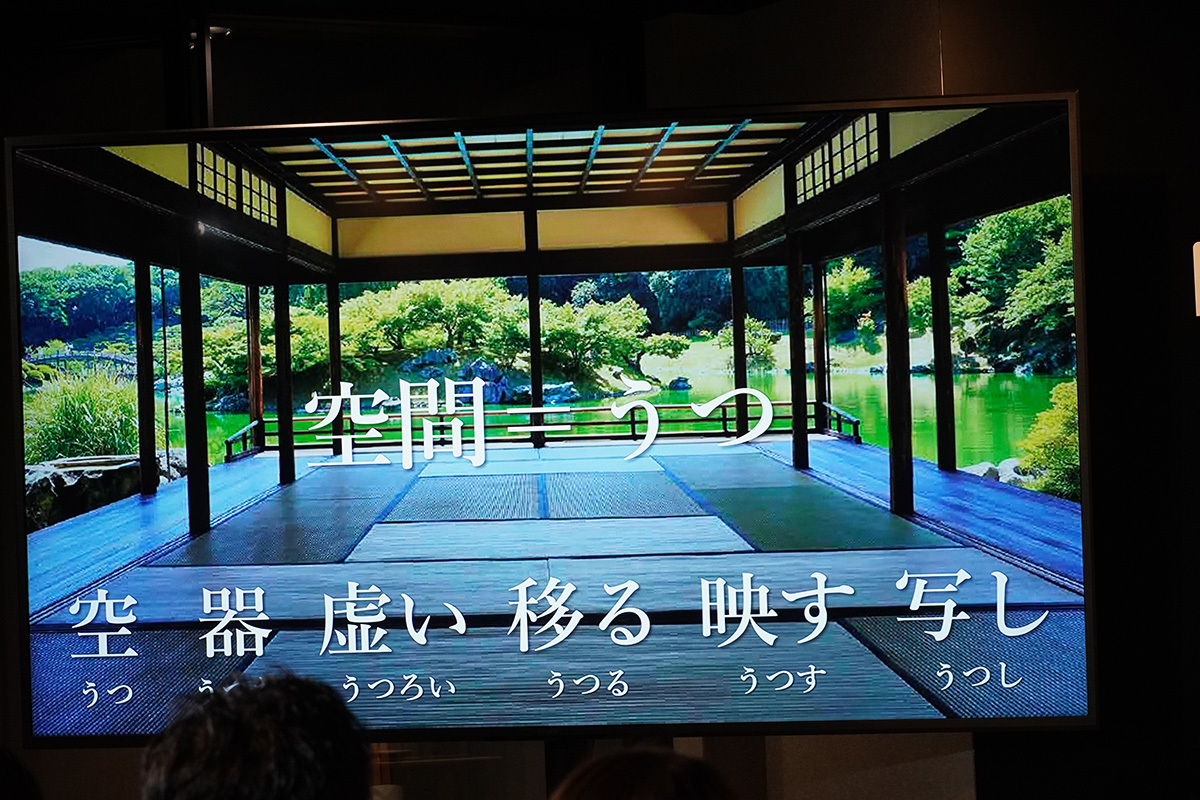 そして「空間演出」について「そもそも、空間とは何なのかということがある」とコメント。「空間の『空(くう)』は空(そら)であり、また、漢字としては『うつ』とも読む。この言葉の響きは『うつわ(器)』『うつろい(虚い)』『うつす(映す)』などにも繋る」と語る。