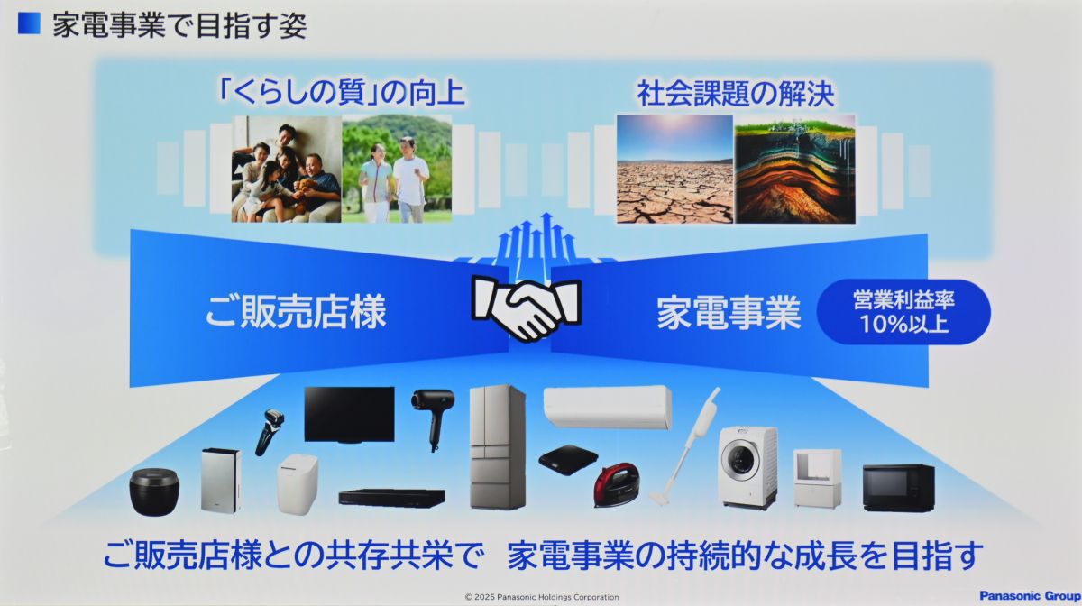 家電事業の目指す姿に対し、将来にわたるお客様の暮らしの質の向上と社会課題の解決に貢献し続けるとした上で「今以上に収益性を高め、しかも価格競争力も高めながら、10%以上の営業利益率を目標においています」と数値目標を挙げる一方で。「これからもご販売店の皆様方との共存共栄でお客様お一人お一人に寄り添いながら、持続的に成長させて参りたい」と、販売店や、何よりも顧客に寄り添って活動していく決意を示した。