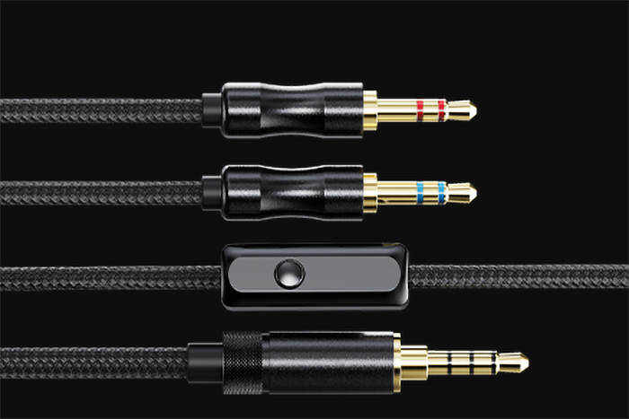ケーブルは左右両出しタイプで、3.5mm 3極プラグによる着脱に対応。付属ケーブルはパラジウムメッキ無酸素銅導体を採用し、マイク付きインラインリモコンを装備するため、音楽再生/停止の操作やスマートフォン/PCでの通話などが行える。3.5mmから6.3mm標準プラグへの変換アダプターも同梱する。
