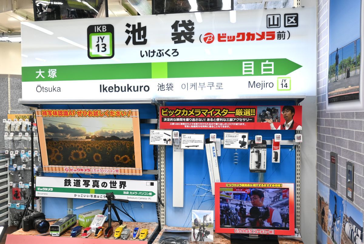 JR山手線池袋駅では、2024年3月より発車メロディが「ビックカメラのテーマソング」となっている。新しい駅名標と同一のものが、カメラ・パソコン館の2階に展示されている。