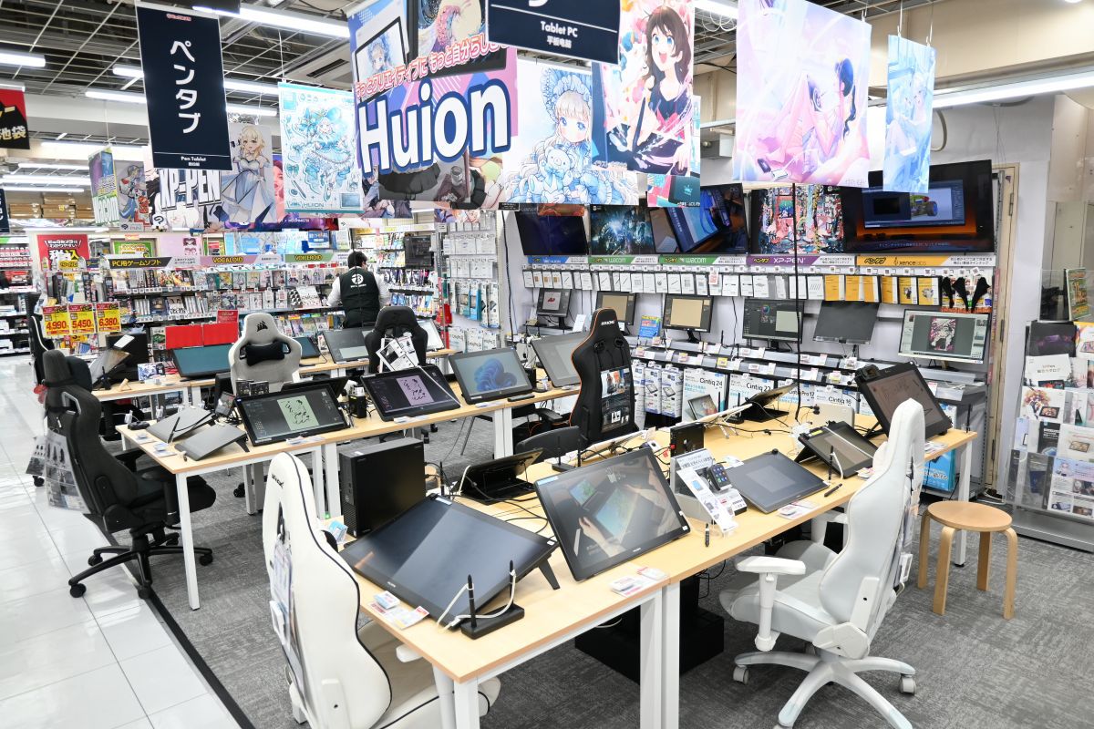 カメラ・パソコン館では、3Fのペンタブレットコーナーも体験・体感を充実させた目玉コーナーのひとつ。広いスペースを割いて多数のモデルを揃え、手軽に試せる環境が整えられている。