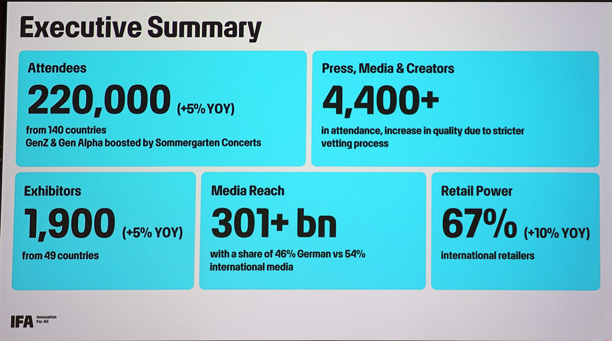「Inovation For All(すべての人にイノベーションを)」を理念に掲げて展開しているIFA。2025年は来場者数(22万人)も出展社数(1,900社)も前年比5%増、小売バイヤーの参加率(67%)も前年比10%増となったことが説明された。日本からの来場者も58%増だったという。
