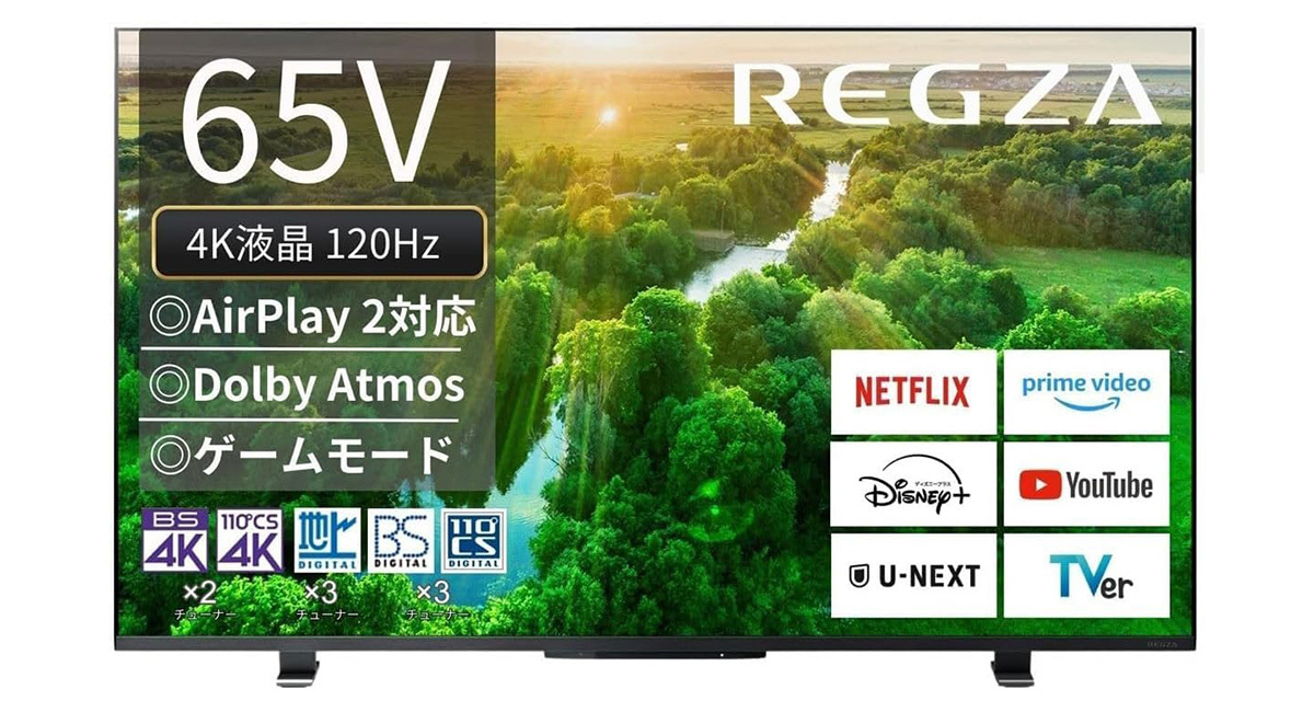 レグザ「Z570L」は65型モデルが56%オフと半額以下に。2022年発売のいわゆる型落ち品であるものの、同社のハイクラス機に与えられる型番「Z」を冠したモデルが大幅値下げとなっている。
