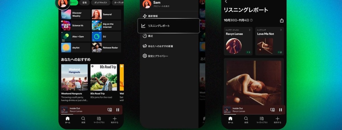リスニングレポートには、Spotifyのプロフィールアイコンをタップすると表示される「リスニングレポート」メニューからアクセスできる。データは24時間ごとに更新され、ユーザーが最近よく聴いている音楽をリアルタイムに確認可能。同時にリスニングデータに基づくおすすめ楽曲/プレイリストや、過去4週間のトップアーティスト/トップソング情報なども表示し、新しい音楽との出会いを後押しするという。