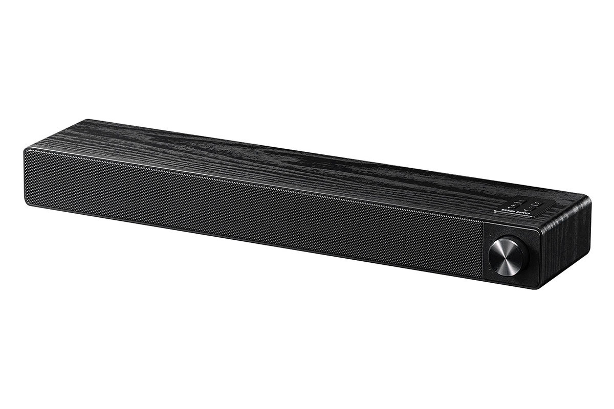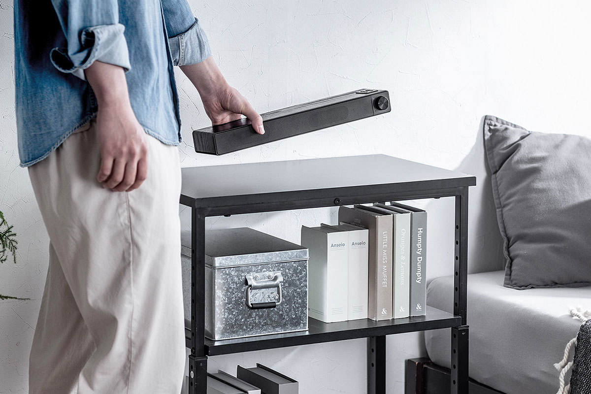 スリム設計により、24型程度のPCモニターから40型前後のテレビまでの画面下に収まりやすく、木目のあるデザインでインテリアにも馴染みやすいとしている。