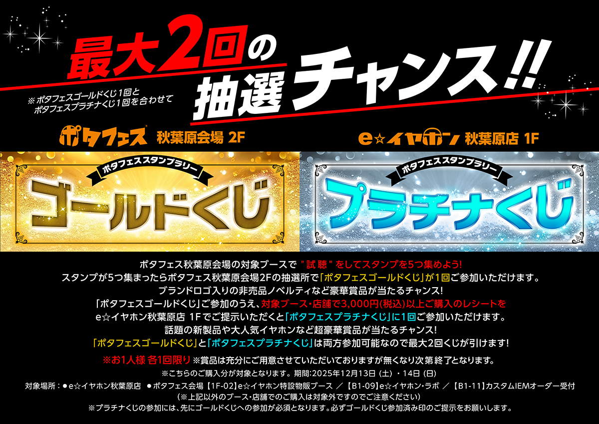来場者参加型の豪華抽選企画も実施される。対象ブースで試聴しスタンプを5つ集めると、「ポタフェスゴールドくじ」に挑戦可能。ブランドロゴ入りの非売品ノベルティをはじめとしたイベント限定アイテムが当たる。