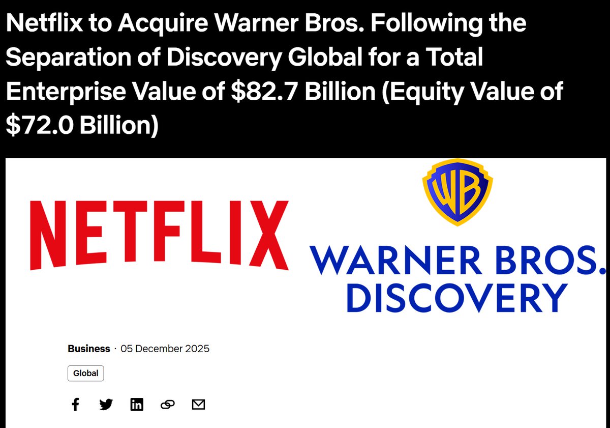 Netflixとワーナー・ブラザースは、Netflixがワーナー・ブラザースを買収する正式契約を締結したことを発表した。買収対象にはワーナー・ブラザース傘下の映画・テレビスタジオ、HBO MaxおよびHBOを含んでいる。