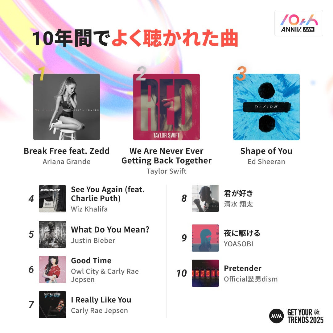 10年間でよく聴かれた曲の1位は、Ariana GrandeとZeddによる『Break Free feat. Zedd』。2位はTaylor Swift『We Are Never Ever Getting Back Together』、3位はEd Sheeran『Shape of You』が続いた。J-POPでは、サービス初期から根強い人気があるという清水翔太「君が好き」や、YOASOBI「夜に駆ける」、Official髭男dism「Pretender」がトップ10にランクイン。多様な年代のが楽曲が混在する結果となっている。