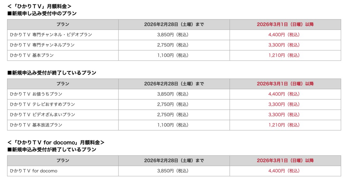 ドコモは、「ひかりTV」「ひかりTV for docomo」の利用料金を2026年3月1日(日)より改訂することを発表。契約プランにより改定価格は異なり、最大で550円値上げされる。