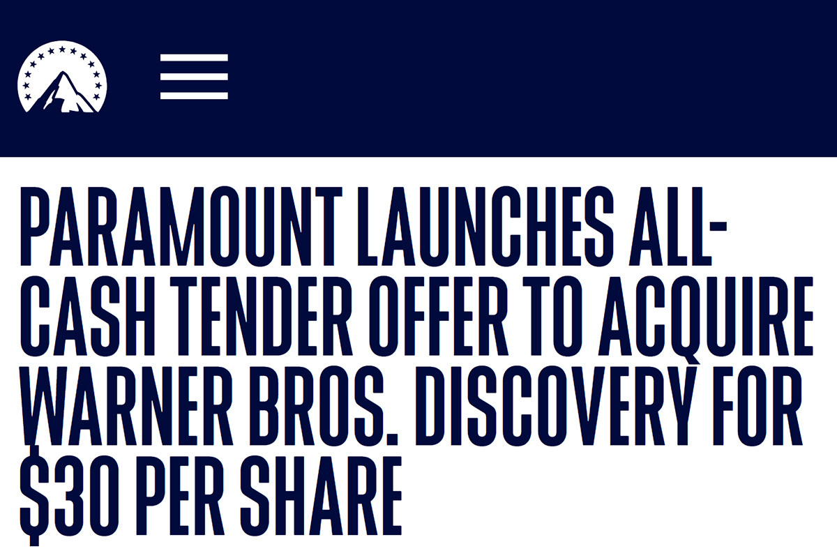 パラマウント・スカイダンスは、ワーナー・ブラザース・ディスカバリーに対して、買収を提案したと発表。ワーナーの株主に対して1株30ドルでの現金による公開買付を開始した。