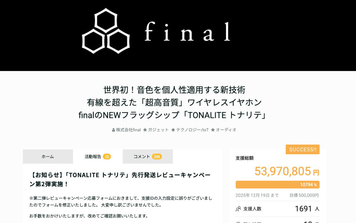 finalは、「GREEN FUNDING」でスタートしている完全ワイヤレスイヤホン「TONALITE(トナリテ)」のクラウドファンディングにて、通常発送より早く製品を入手できる可能性がある「先行発送レビューキャンペーン第2弾」を実施している。