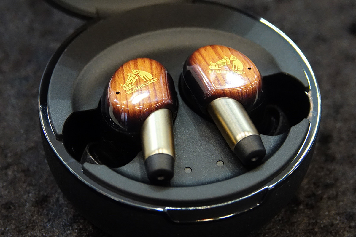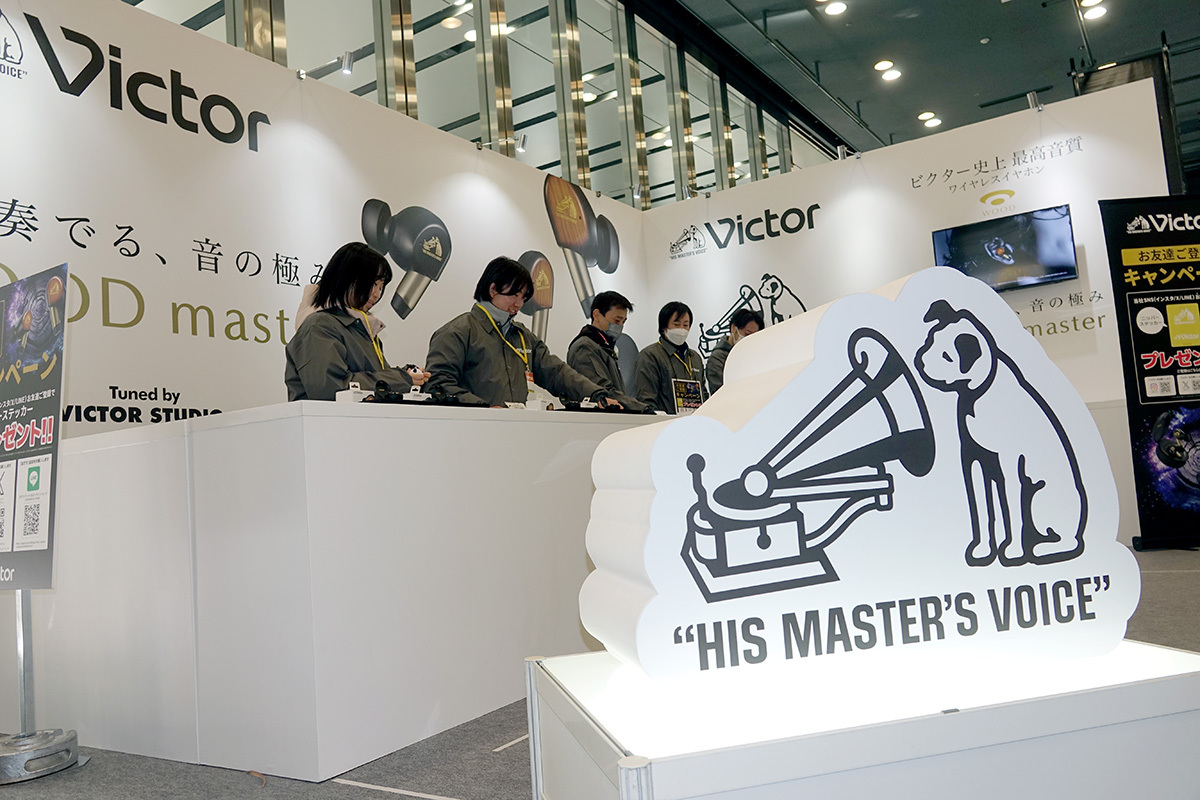 JVCケンウッドのブースでは、ビクターブランドのトレードマークである“犬のマーク” ニッパーくんのオブジェが来場者をお出迎え。11月に発売したばかりの新フラグシップ完全ワイヤレスイヤホン “WOOD master”「HA-FW5000T」を試聴できるようにしている。