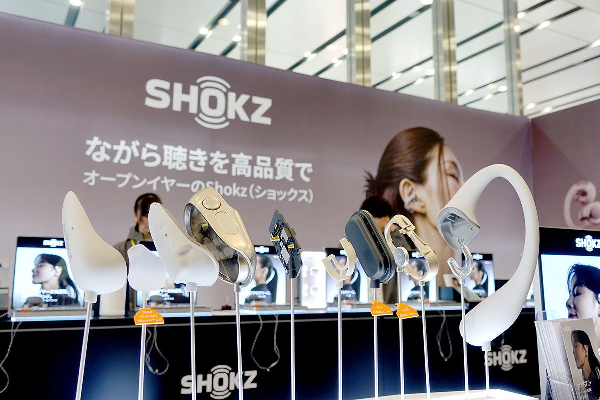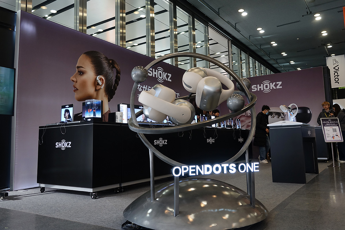 SHOKZのブースでは、イヤーカフ型ながら聴きイヤホン「OpenDots ONE」の巨大オブジェが来場者をお出迎え。もちろん実機も多数用意されている。