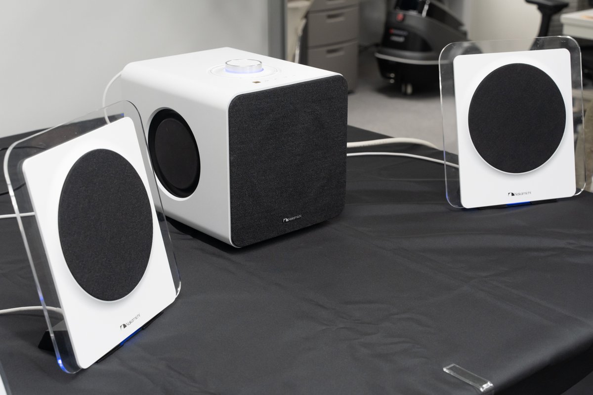 「Krystal SOUND STAION」は、プラナーの薄さを活かした超薄型設計のメインユニット 2基と、コントロールボックスを兼ねるサブウーファーユニットを組み合わせた2.1chワイヤレススピーカーシステム。各ユニット間の接続も完全にワイヤレスで行われ、給電ケーブルのみ接続が必要となる。