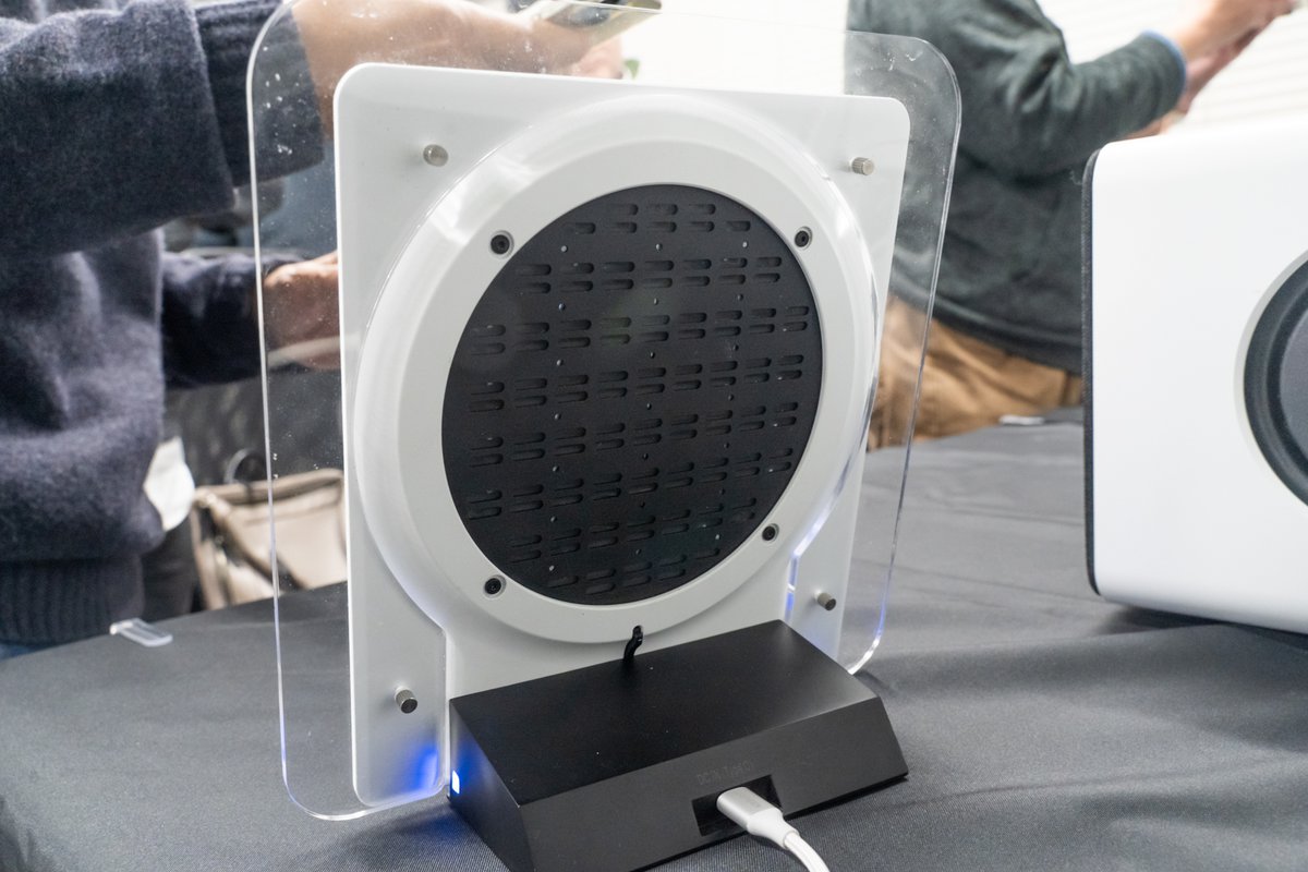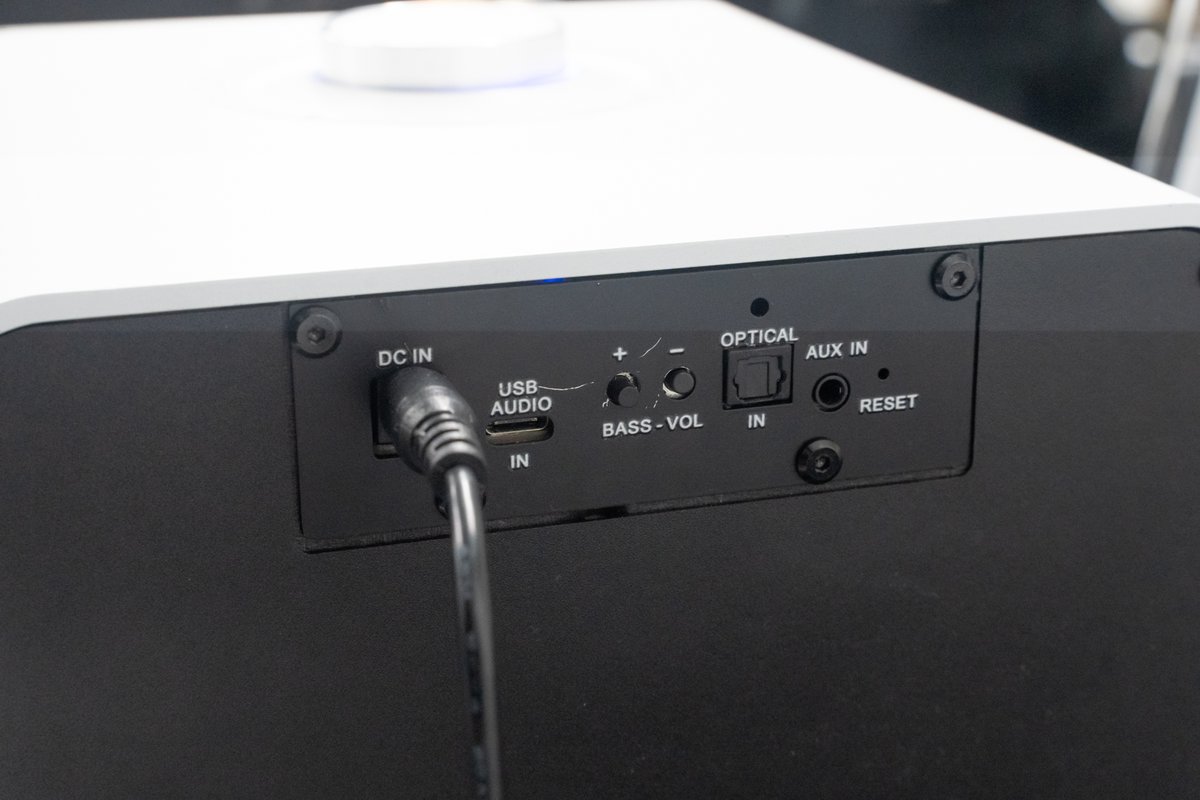 入力はBluetoothを基本として、USB-C、光デジタル、3.5mmアナログ入力に対応。端子はサブウーファーユニットに装備する。なおSigneo Design社社長のケビン氏によれば、サブウーファーを抜いてメインユニット同士をペアリングし、ステレオ再生させることも可能だそうだ。
