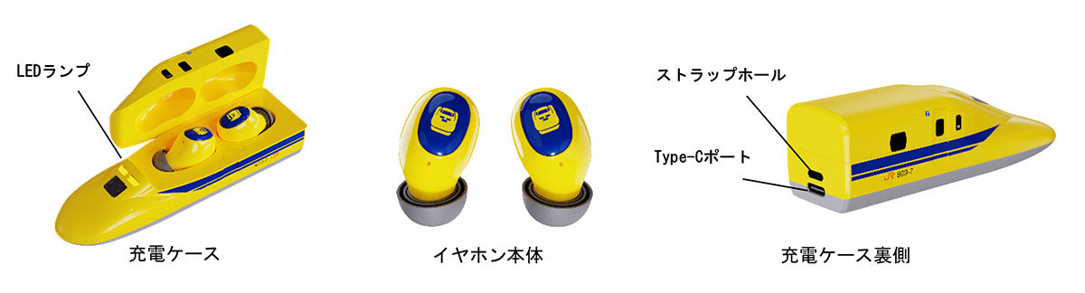 デザイン面では、充電ケースに車両の外観イメージを細部まで反映点が特徴。ヘッドライトや尾灯部分にはLEDを搭載し、ケースの開閉時やケーブル接続時に点灯するギミックを備える。イヤホン本体には、新幹線乗り場案内のピクトグラムをドクターイエロー風にアレンジしたデザインを採用した。