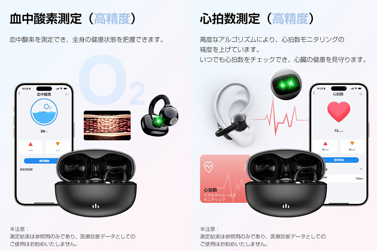 心拍・血中酸素測定に対応したイヤーカフ型ワイヤレスイヤホン
