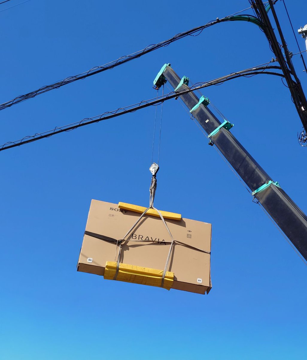 お客様が要望する寝室は、2年前のシアタールームと同じ2階にある。「2階にはグランドピアノもありましたから、98V型テレビくらい余裕だろうと判断しました。ただ、“フツー” に搬入はできませんので、クレーンで引き上げることになりました」。その光景が「空飛ぶBRAVIA」というわけだ。