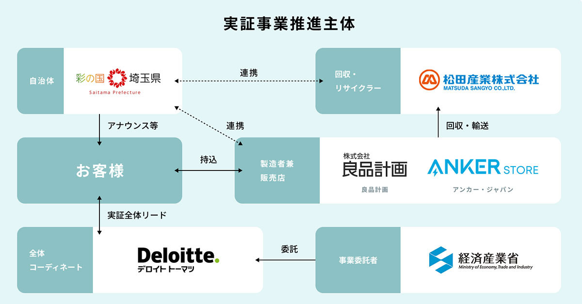 実証実験においてアンカー・ジャパンは、中心的な実施主体として埼玉県内のAnker Store 3店舗に回収ボックスを設置し、店舗での回収および管理業務を担当する。また、経済産業省および合同会社デロイトトーマツは事業受託者・実証事業事務局として制度設計や進行管理を担い、埼玉県は協力自治体として市民への周知などを行う。