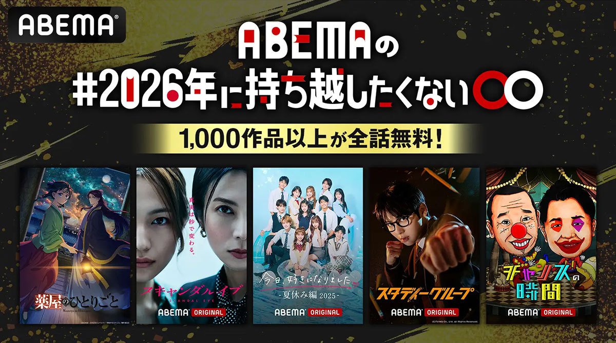 ABEMAは、12月22日(月)から12月31日(水)までの期間限定で、配信中の1,000作品以上を全話無料で楽しめる特別企画『#2026年に持ち越したくない◯◯』を開催する。