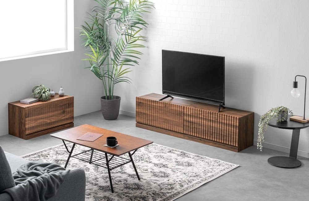 前板に波状の立体デザインを採用し、光の当たり方で陰影が生まれる意匠とした。縦ラインを等間隔で揃えることで、複数台を連結しても継ぎ目が目立ちにくく、1台の長尺テレビ台のような統一感を演出するという。