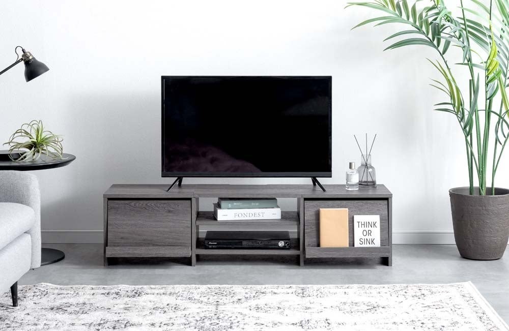収納は扉付きスペースを備え、リモコンやゲーム機、周辺機器などの生活感の出やすいアイテムをまとめて収納できる。