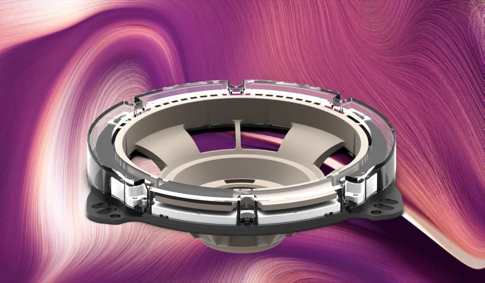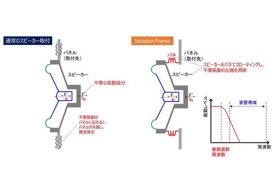 開発中のアフターマーケット向け車載スピーカーには、同社がこの度新たに開発した技術「Isolation Frame」を投入予定。これは吸音材や制振シートを用いる「デッドニング」とは異なる、スピーカーからドアへの振動伝達そのものを遮る振動抑制機構だといい、スピーカー交換のみで明瞭な低域再生が実現できるという。