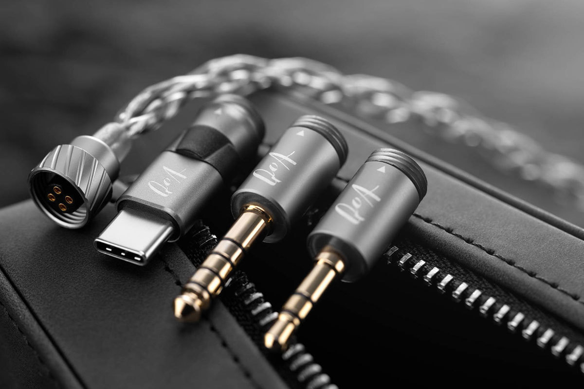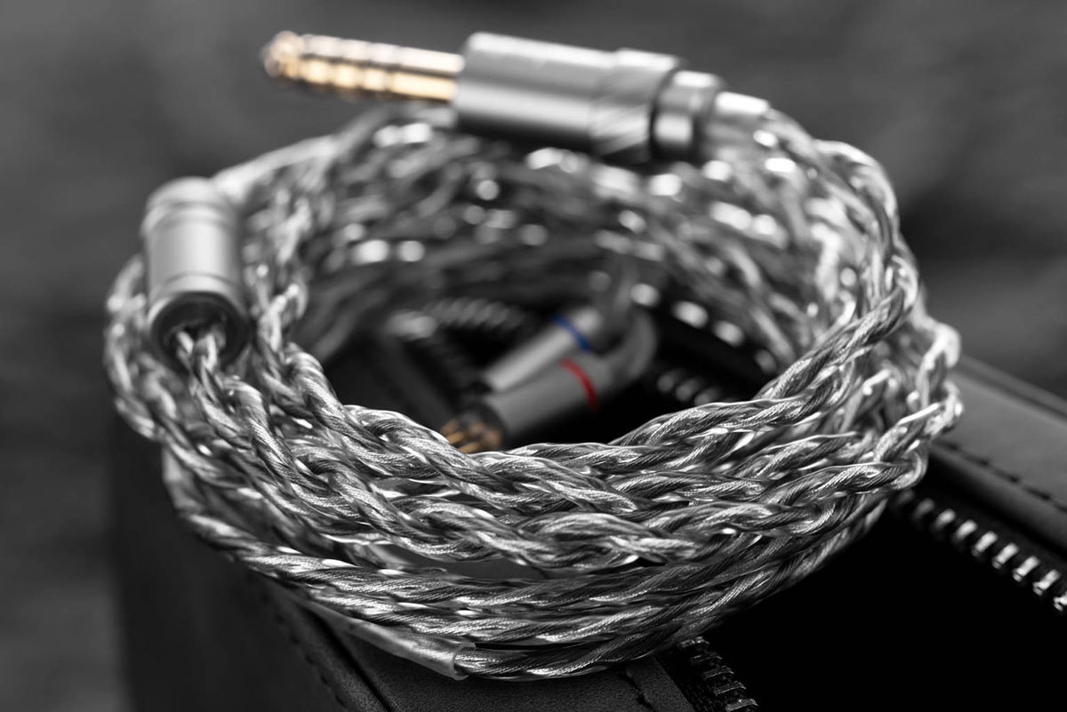 付属ケーブルは銀メッキ高純度銅を用いたクロス編み構造で、0.78mm 2ピンコネクターにより着脱が可能。プラグも着脱交換が可能で、3.5mm/4.4mmバランス/DAC内蔵USB Type-Cの交換用プラグが用意される。イヤーピースは、音の傾向が異なる3種類(パープル/ブラック&レッド/ブラック)をの各サイズで同梱する。