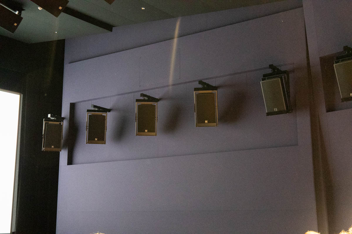 サラウンド環境については、エレクトロボイスのスピーカーを左右の壁に9基ずつ、天井に9基を2列、背後の壁面に6基と、合計42基のスピーカーが設置される。またサラウンド用のサブウーファーを4基、スクリーンチャンネルは従来通りのLCRとして配置されている。天井にもスピーカーを設けることで、ドルビーアトモスだけでなくIMAXの12chに対応した音響作品制作も作ることができるようになった。