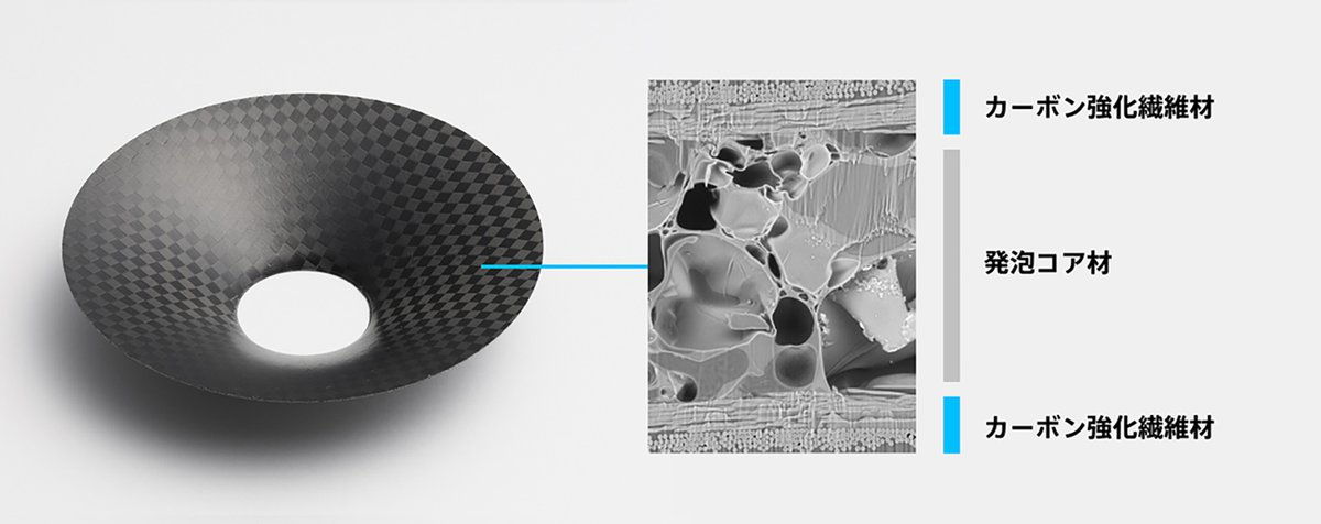 多層カーボンファイバー複合振動板は、上下層のカーボン強化繊維材料が中層の独立気泡発泡コア材を挟みこむサンドイッチ構造を採用。