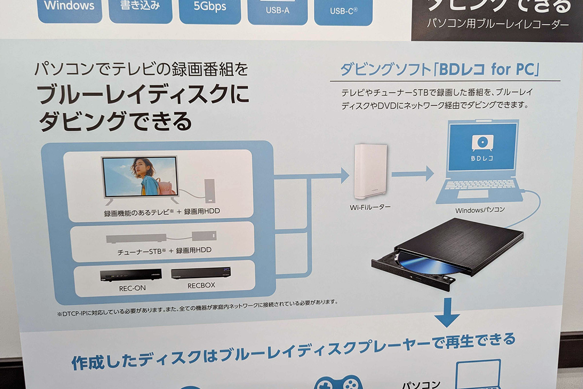 Windowsパソコンに接続して使用する外付けBDドライブで、ソフト「BDレコ for PC」によってパソコンで番組をブルーレイディスクにダビング可能。