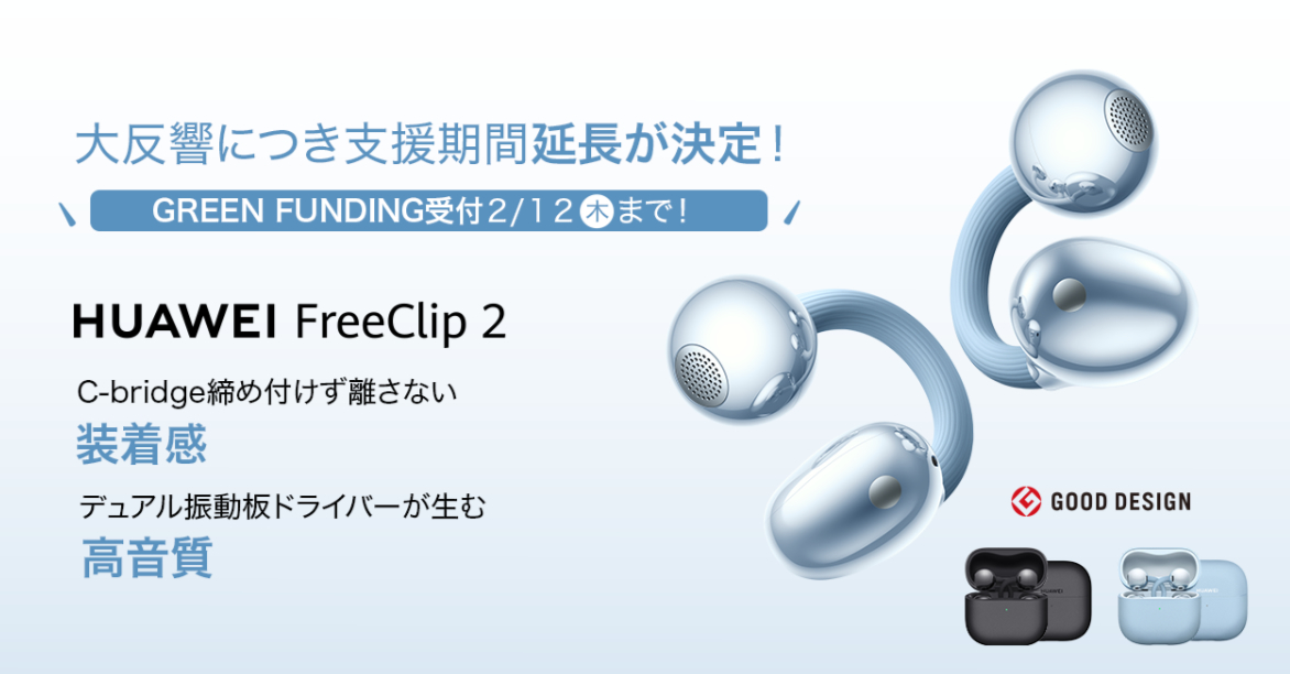 ファーウェイ・ジャパンは、クラウドファンディングサイト「GREEN FUNDING」で先行支援を実施中のイヤーカフ型完全ワイヤレスイヤホン「HUAWEI FreeClip 2」について、支援受付期間を当初の2026年2月1日(日)から2月12日(木)までに延長すると発表した。