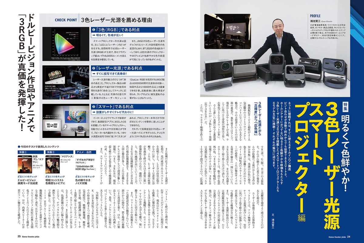 スマートプロジェクター特集は2つのパートに分けてお届け。まずパート1では、3色レーザー光源の高級スマートプロジェクターを横並びテストしています。VGPアワードの審査員 鴻池賢三先生に、いまさら聞けない、3色レーザーならではのメリットもわかりやすく解説していただきました。