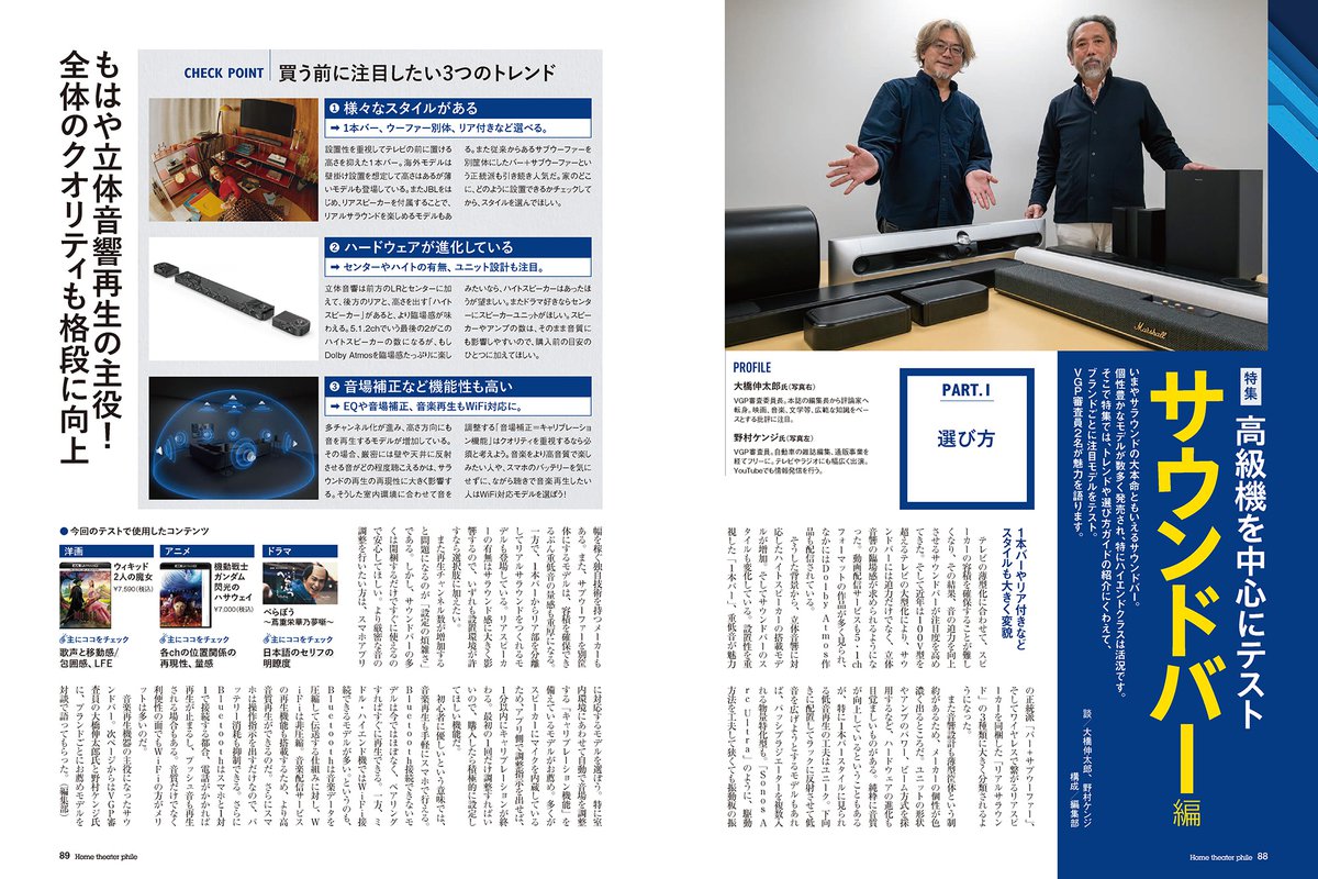 そしてサウンドバー特集は、ほぼ全価格帯が新製品に入れ替わったJBLブランドを徹底解剖しているほか、各社のフラグシップ級のアイテムを横並びテストしています。こちらはVGP審査員の大橋伸太郎先生と野村ケンジ先生に徹底テストしていただきました。