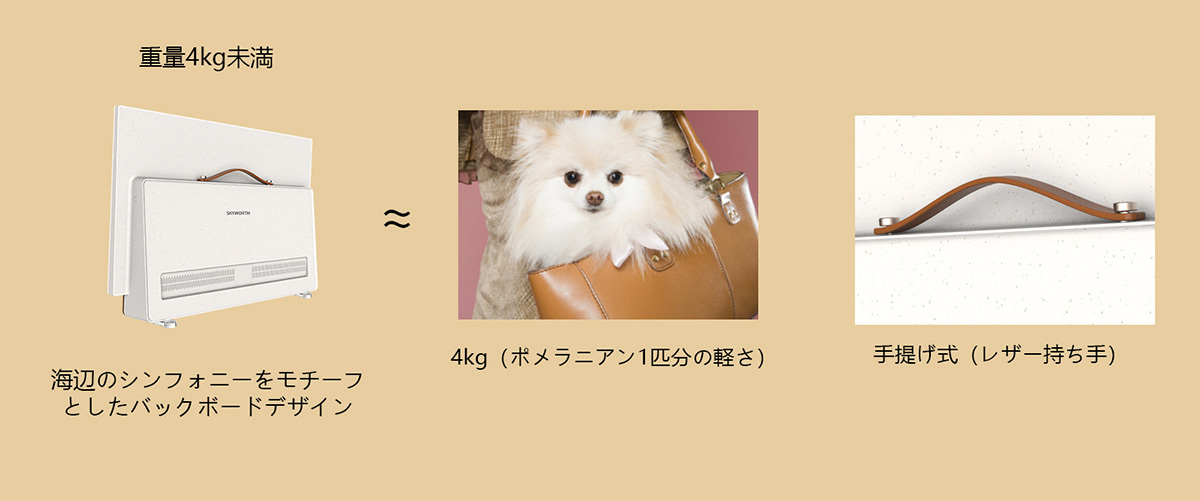 本体質量は約4kg未満で、本体背面のレザーの持ち手により容易に持ち運びできると説明。同社独自開発の低ブルーライト技術も搭載する。